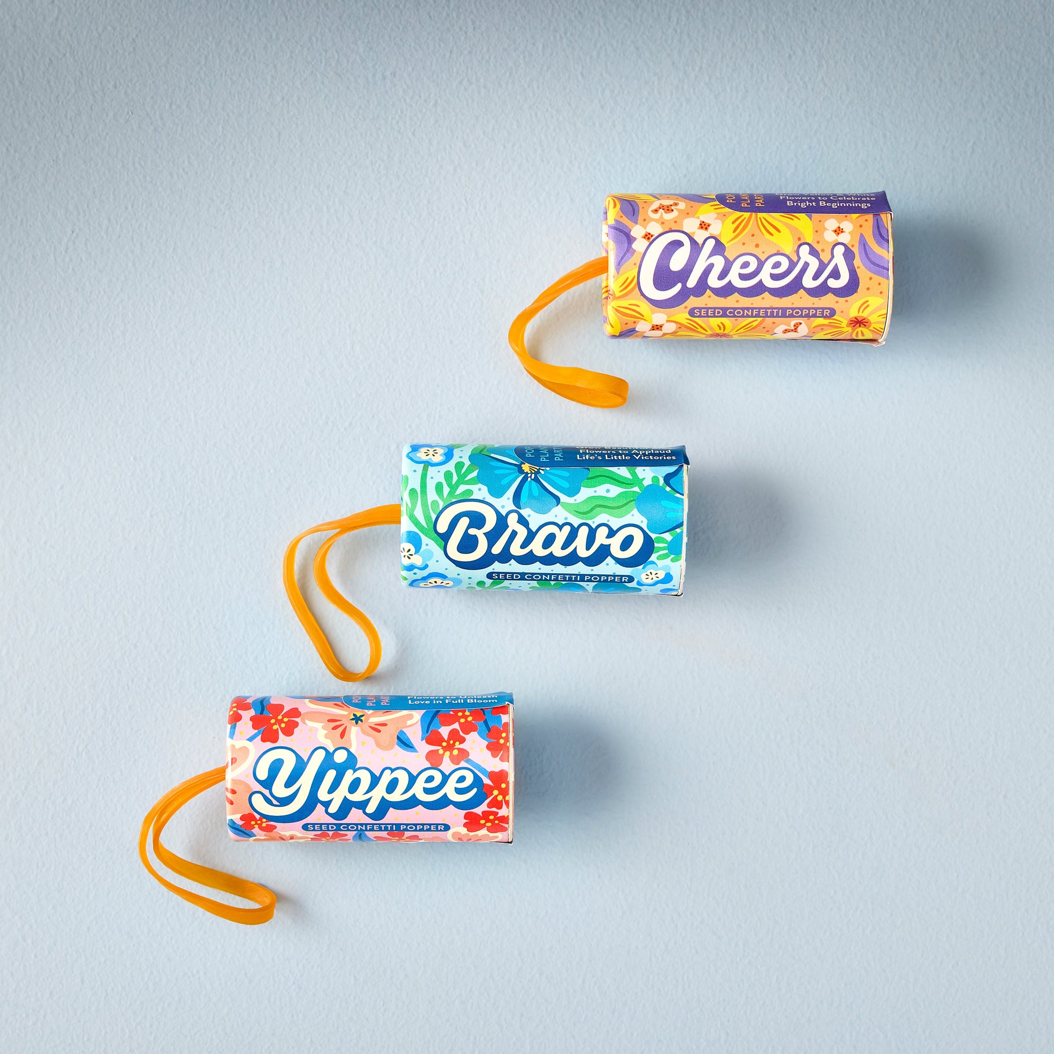 Pop, plant and party! Seed Confetti Poppers are a reusable twist on traditional party poppers. Skip the plastic (and the clean up) and keep the party going as each piece of confetti contains a curated blend of flower seeds. Pop and grow red and pink for love; yellow and white to spread cheer; or blue blooms to applaud big accomplishments. To use, simply peel off the cap, pull back the rubber band and propel seed confetti high into the air or across the earth.